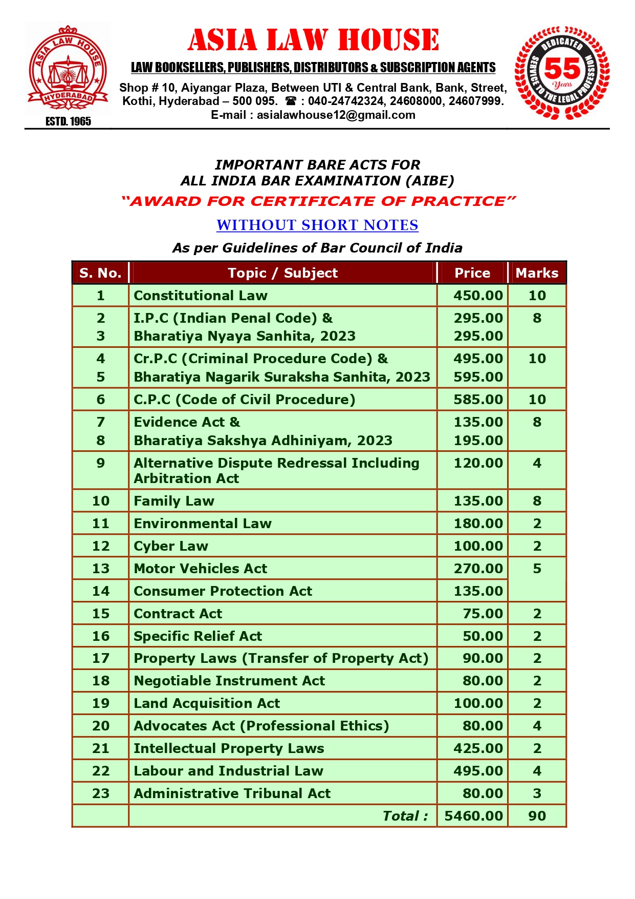 Bare Act Without Short Notes ( as per guidelines of Bar Council of India ) Set of 23 Bare Acts - ALL INDIA BAR EXAMINATIONS AIBE